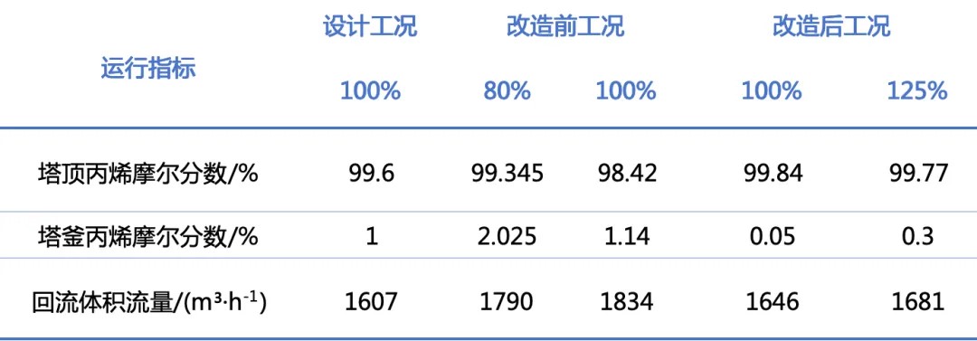 改造后的丙烯精馏塔重新开车,稳定运行后,苏尔寿化工对该塔的运行数据进行了收集分析,并与工艺包设计数据、改造前运行数据进行了对比。对比结果表明,改造后丙烯精馏塔塔顶丙烯产品指标、塔釜丙烯损失、回流比以及处理能力等指标均优于工艺包设计值,相较于改造前的运行数据有了大幅度的提升。具体数据如表1所示。
