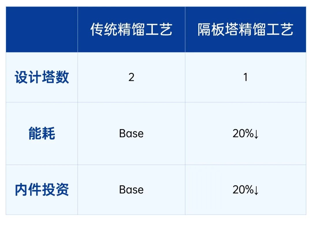相较于传统的多塔串联工艺,此套隔板塔装置在满足产品纯度要求的情况下,完成分离任务所需的精馏塔数由两台降为一台,大幅降低了前期工程投资,同时装置能耗和内件投资也显著降低。