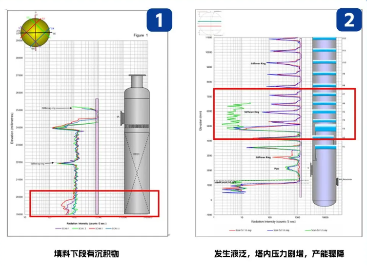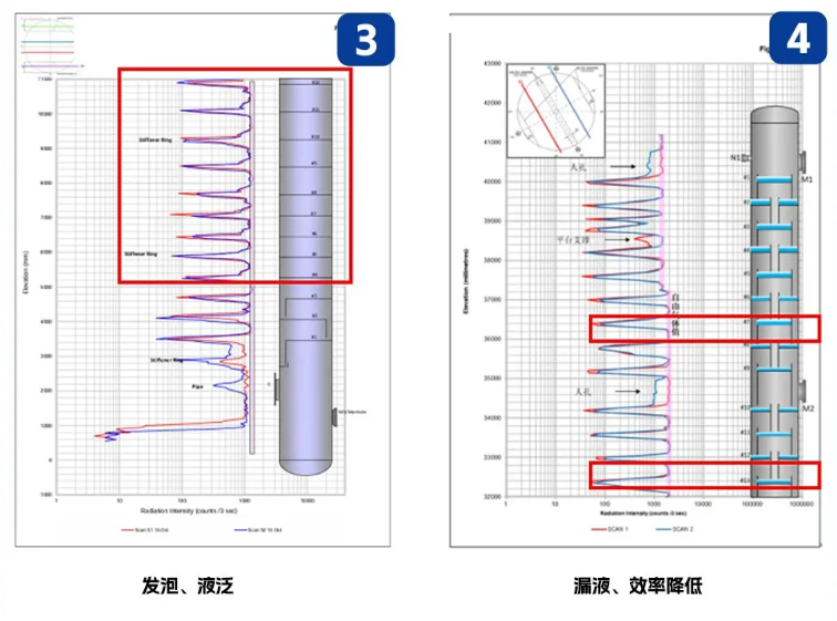 • 淹塔:可以通过扫描判断淹塔的原因,是因为塔盘损坏引起还是内部介质引起。